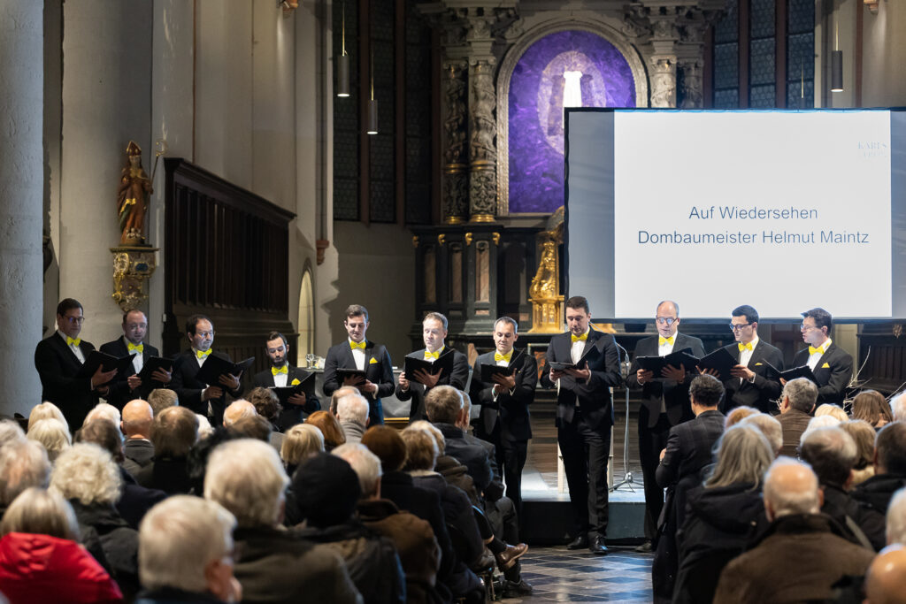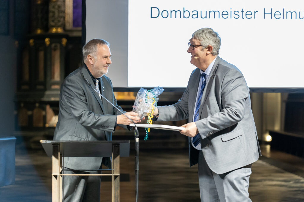 Fachpraktiker, Bauingenieur, Welterbemanager, Fundraiser, Allrounder, Kollege, Chef und Medienmann – mit „oktogonalen acht Schlagworten“ verabschiedete Dompropst Rolf-Peter Cremer seinen mit Abstand bekanntesten Mitarbeiter Helmut Maintz in den Ruhestand. Seit 37 Jahren stand der 64-Jährige in den Diensten des Domkapitels, seit 2000 trug er den Titel Dombaumeister. „Sie waren immer das freundliche und sympathische Gesicht des Doms, wussten faszinierende Geschichten zu erzählen und haben die Menschen damit erreicht,“ stellte Cremer heraus.