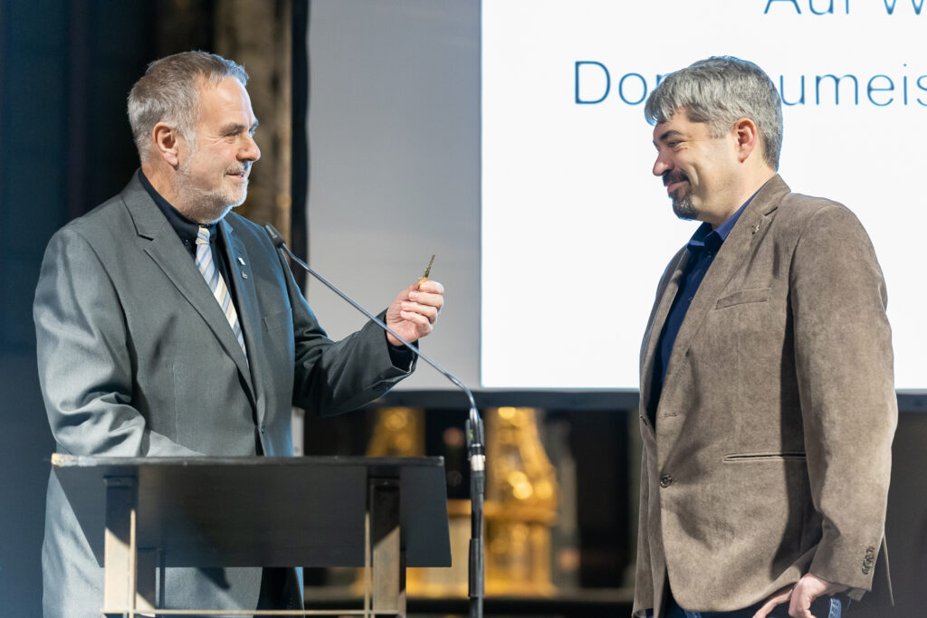 Die große Anerkennung für den Dombaumeister spiegelte sich schließlich in langanhaltenden Ovationen der mehreren hundert Gäste wider, die zum Abschied in die Citykirche gekommen waren. Sie erlebten mit, wie Dompropst Cremer den Generalschlüssel an Dr. Jan Richarz weitergab, der ab sofort die aktuellen und sehr technisch geprägten Projekte übernehmen und zu Ende führen wird.