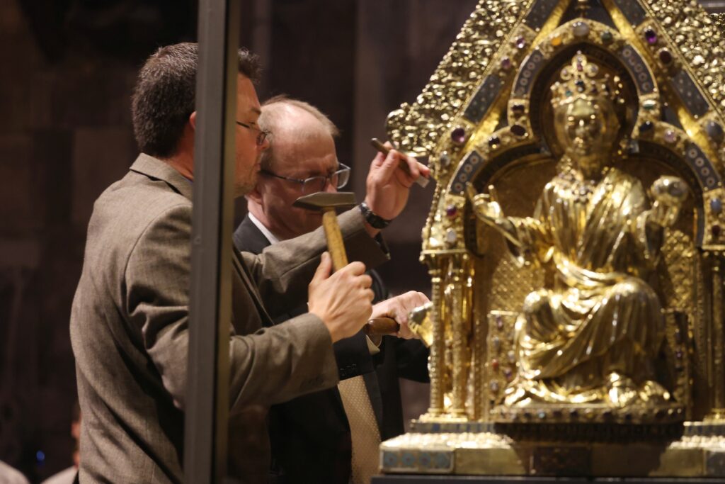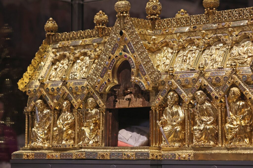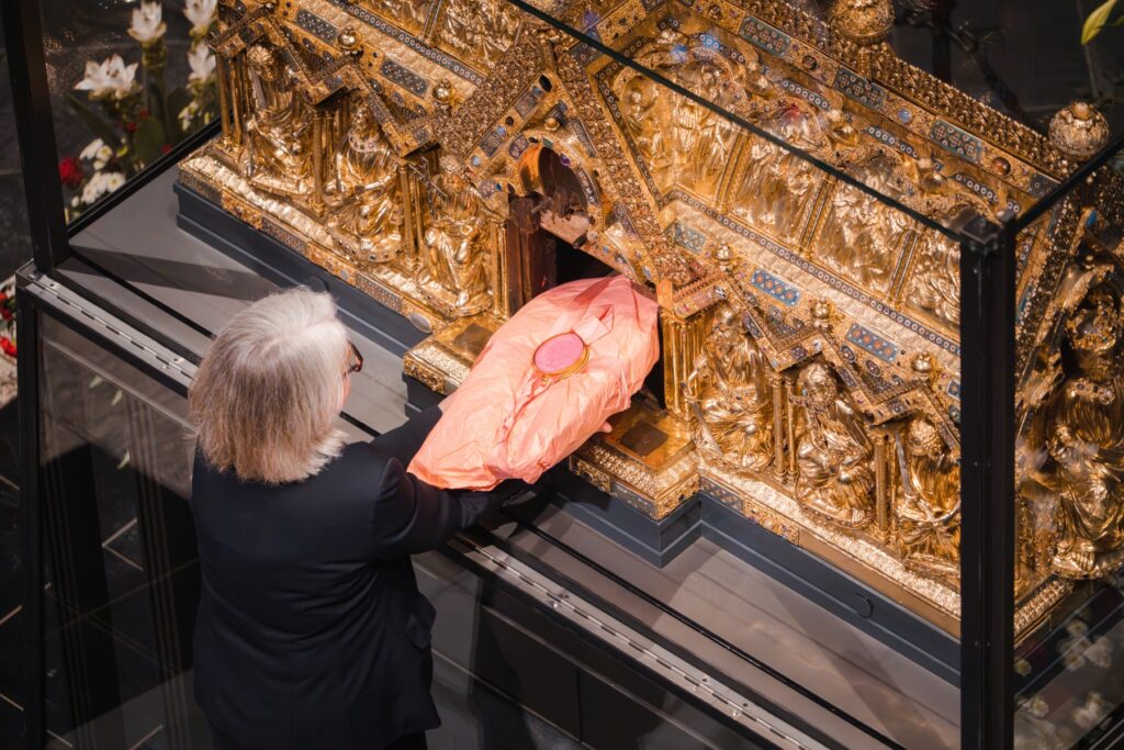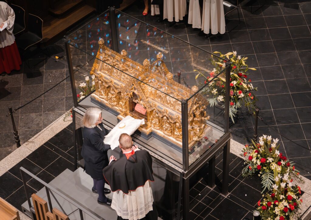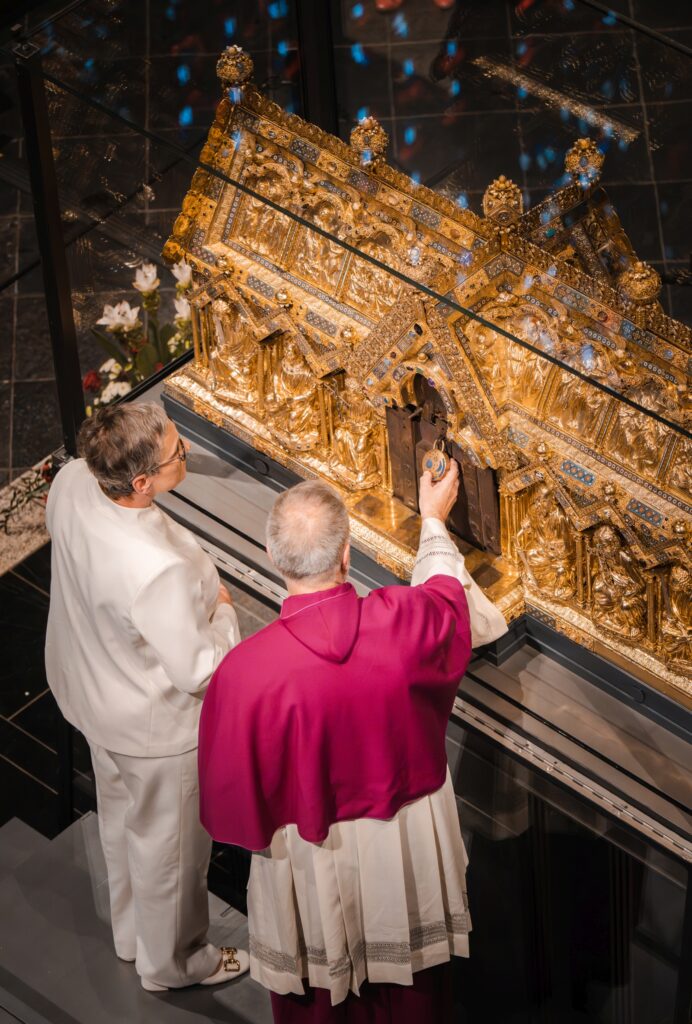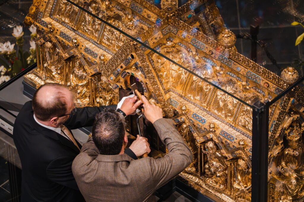 Donnernd tönen die Hammerschläge in die Stille des Aachener Doms: Es ist der Moment bei der Erhebung der Heiligtümer, bei dem alle mitzählen: Wie viele Schläge braucht der Goldschmied, um den Bügel des Schlosses am Marienschrein zu öffnen? Wie viele Schläge, bis die Heiligtümer – das Kleid Mariens, die Windel Jesu, das Enthauptungstuch Johannes‘ des Täufers und das Lendentuch Jesu – den Menschen nach neun Jahren wieder gezeigt werden können?