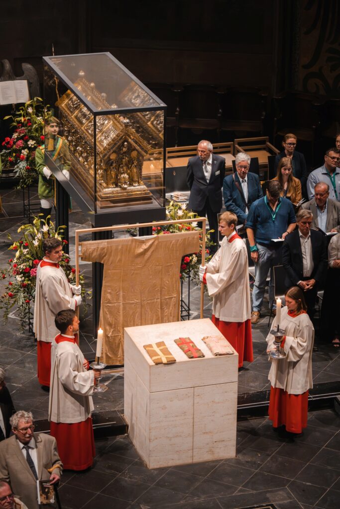 Genau 29 Hammerschläge sind es, Gold- und Silberschmied Thomas Zintzen das Schloss geöffnet hat. Dr. Birgitta Falk, Leiterin der Domschatzkammer, entnimmt anschließend die vier Heiligtümer dem Marienschrein, um sie dem Domkapitel zu übergeben. Die Heiligtümer sind sorgfältig mit farbigen Seidenstoffen umhüllt, die mit Wachs versiegelt sind. Die Unversehrtheit dieser Siegel überprüfen Oberbürgermeisterin Sibylle Keupen und Dompropst Rolf-Peter Cremer. Anschließend packen jeweils zwei Schwestern von vier Aachener Ordensgemeinschaften die Reliquien in der Sakristei aus. Dann werden sie zum ersten Mal den Gläubigen zur Verehrung gezeigt.