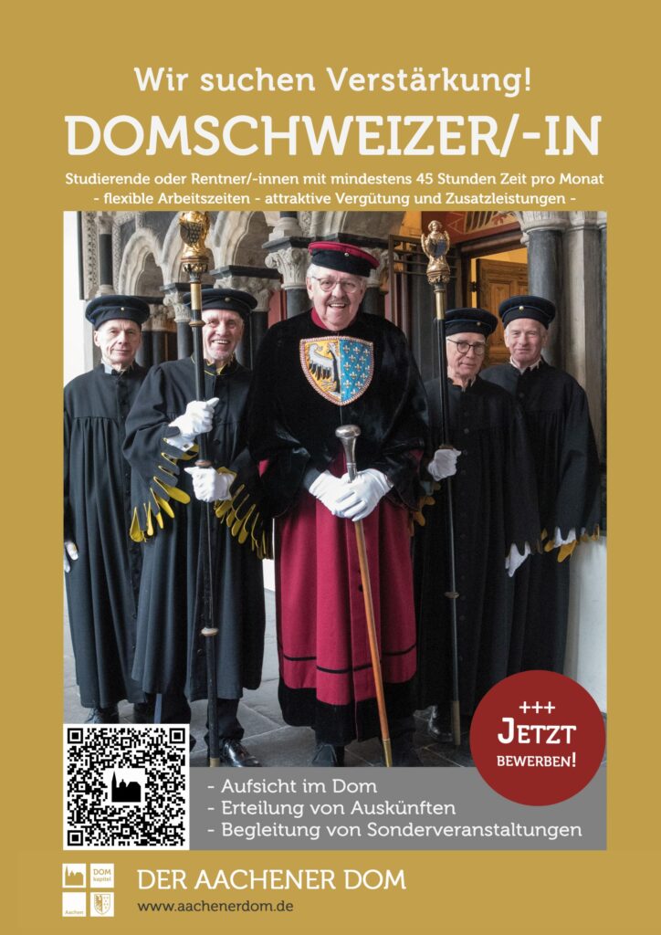 Das Domkapitel sucht ab sofort Domschweizer/-innen (m/w/d). Die Stelle ist geeignet für Studierende sowie für Rentner/-innen, die nach dem Eintritt in den Ruhestand eine neue Aufgabe suchen. Die Mindeststundenzahl beträgt 45 Stunden/Monat.