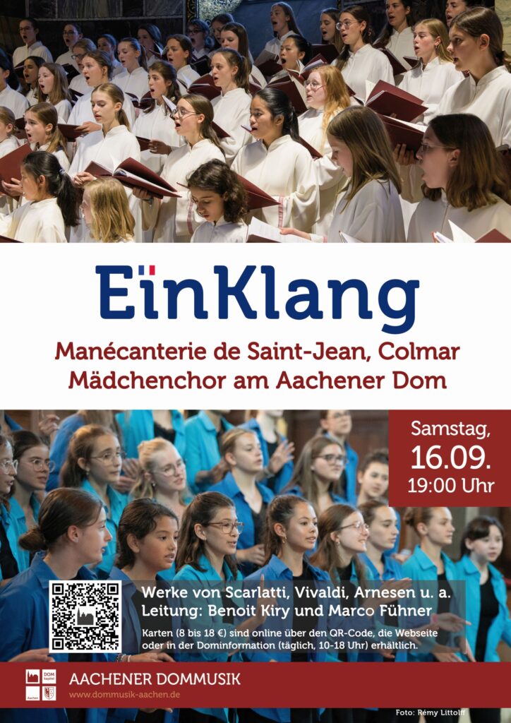 Im September kommt es nun zu einem Wiedersehen: Der Mädchenchor aus dem Elsass reist nach Aachen! Am Samstag, 16. September, um 19 Uhr, gestalten die beiden Ensembles gemeinsam ein Konzert mit Werken von Scarlatti, Vivaldi und Arnesen. Das Motto „EinKlang“ unterstreicht dabei die musikalische Verbundenheit zwischen dem deutschen und dem französischen Chor. Karten zum Preis von 8 bis 18 Euro können ab sofort in der Dominformation oder online erworben werden: