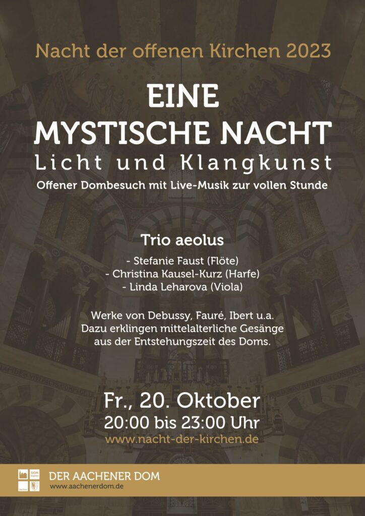 In der Mitte des Oktogons – unterhalb des fast 1000 Jahre alten Barbarossaleuchters – wird das Instrumentalensemble „Trio aeolus“ das Mystische des Doms klangvoll in Szene setzen. Stefanie Faust, Christina Kausel-Kurz und Linda Leharova spielen an Flöte, Harfe und Viola unter anderem Werke von Debussy, Fauré und Ibert. Zusätzlich erklingen mittelalterliche Gesänge aus der Entstehungszeit des Doms. Währenddessen können die Besucherinnen und Besucher durch das Sechzehneck und die Chorhalle wandeln und die Wirkung der neuen Beleuchtung in Augenschein nehmen. Insbesondere die neu ausgeleuchteten Mosaikmotive laden zu einer näheren Betrachtung ein. Die Musik beginnt jeweils zur vollen Stunde und dauert etwa 45 Minuten.