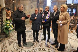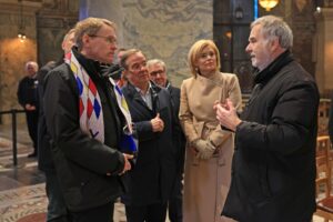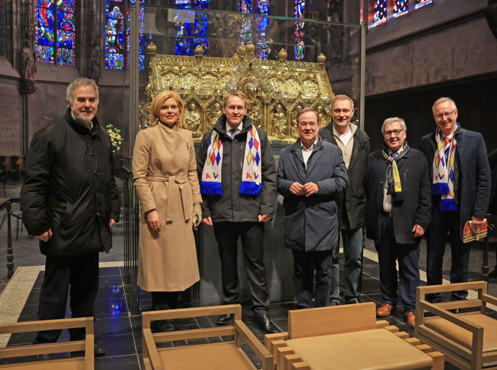 Dompropst Rolf-Peter Cremer schlüpfte in die Rolle des Domführers und zeigte im Schnelldurchlauf die sehenswertesten Highlights wie das Gnadenbild, die Pala d’Oro und die Schreine. Mit einem Augenzwinkern machte Julia Klöckner Finanzminister Lindner auf das viele Gold aufmerksam. Nicht weniger aufmerksam lauschten die Besucher und die Besucherin aber auch den Geschichten und Anekdoten, die der Dompropst zu erzählen hatte. Und Zeit für ein Gruppenfoto fand sich auch noch. Wir freuen uns über das Interesse und gratulieren Daniel Günther zum Erhalt des AKV-Ordens.