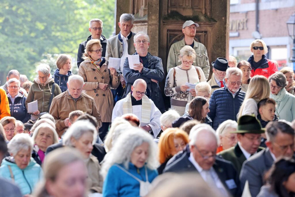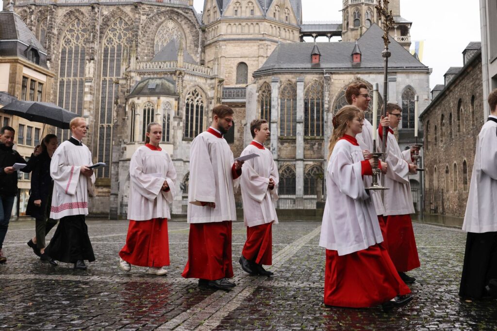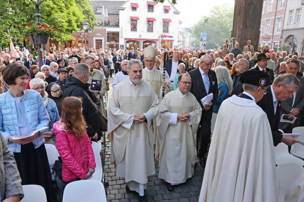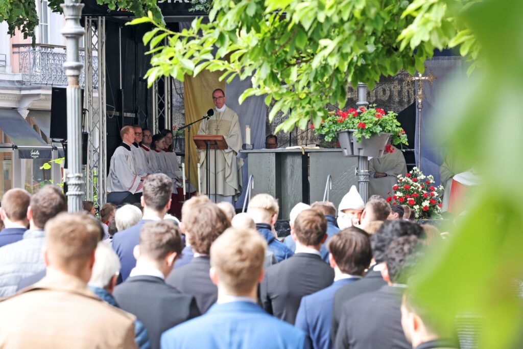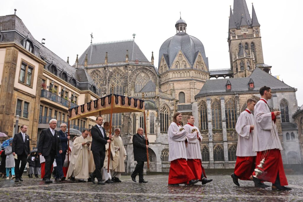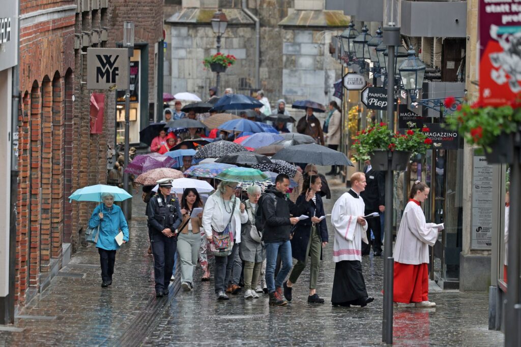 Da half auch kein Daumendrücken: Die gestrige Fronleichnamsfeier begann hoffnungsvoll heiter und endete unverhofft nass. Da die Wetter-Apps erst mit Schauern ab 13 Uhr rechneten, hatten sich ca. 600 Gläubige auf dem Münsterplatz eingefunden, um unter freiem Himmel den gemeinsamen Gottesdienst des Aachener Domkapitels und der Aachener Innenstadtpfarrei „Franziska von Aachen“ zu feiern. Mit dabei waren die Karlschützengilde, Abordnungen Katholischer Deutscher Studentenverbindungen und die Polnischsprachige Gemeinschaft.