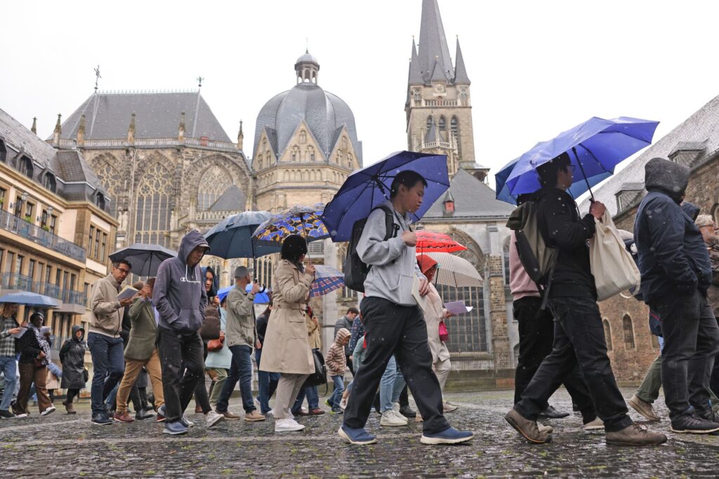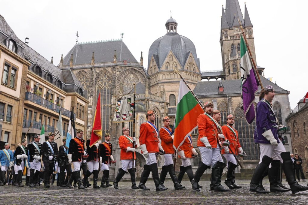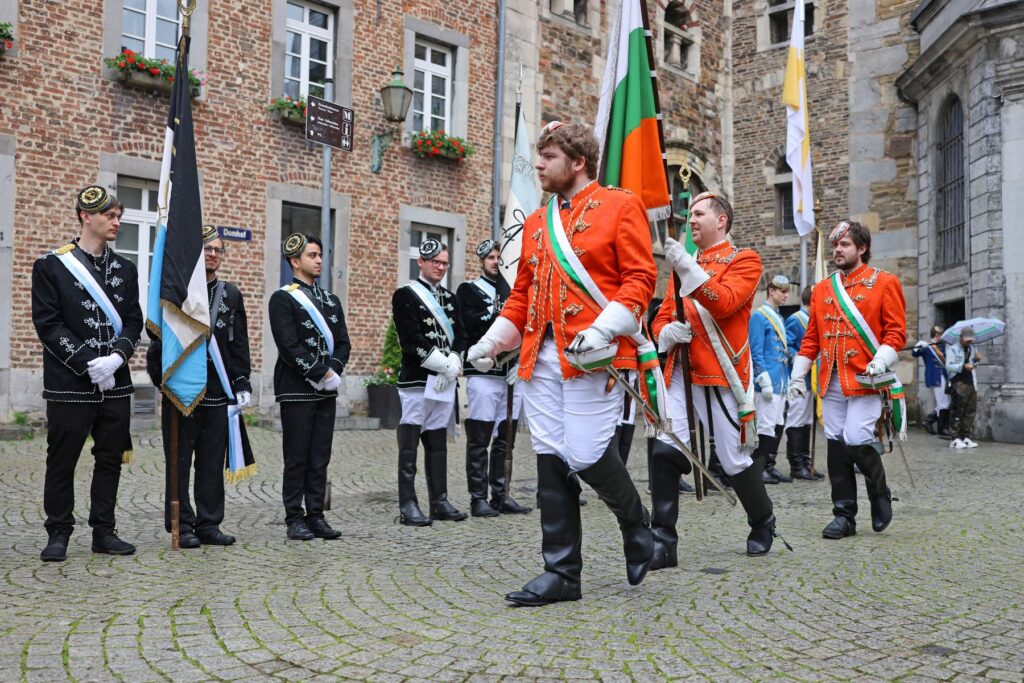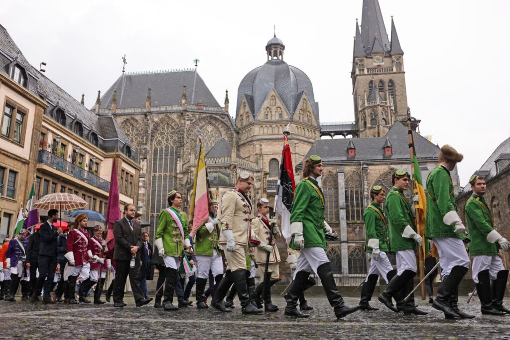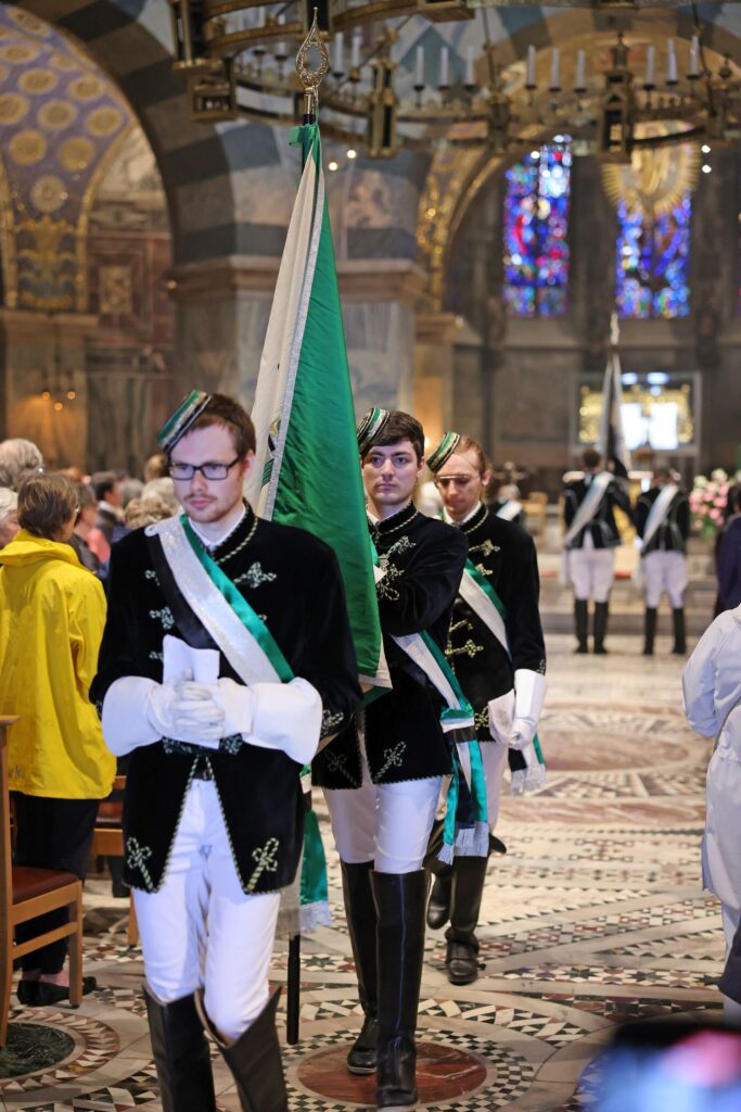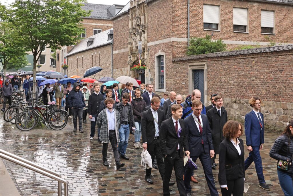Da half auch kein Daumendrücken: Die gestrige Fronleichnamsfeier begann hoffnungsvoll heiter und endete unverhofft nass. Da die Wetter-Apps erst mit Schauern ab 13 Uhr rechneten, hatten sich ca. 600 Gläubige auf dem Münsterplatz eingefunden, um unter freiem Himmel den gemeinsamen Gottesdienst des Aachener Domkapitels und der Aachener Innenstadtpfarrei „Franziska von Aachen“ zu feiern. Mit dabei waren die Karlschützengilde, Abordnungen Katholischer Deutscher Studentenverbindungen und die Polnischsprachige Gemeinschaft.