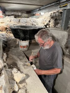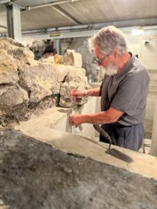 Erster Schritt ist zunächst eine gründliche Reinigung. „Wir machen hier picobello sauber, saugen und fegen den Staub und Schmutz weg, den wir vor der Entsorgung noch durchsieben“, erklärt Schaub. Anschließend soll die archäologische Grabungsstelle fotografisch dokumentiert, eventuell als 3D-Aufnahme gescannt und mit alten Bestandsaufnahmen verglichen werden: Mitte der 1980er Jahren wurde die gesamte Schaugrabung vom Landschaftsverband Rheinland (damals noch als RAB = Rheinisches Amt für Bodendenkmalpflege bekannt) dokumentiert. Zu jeder Mauer existieren Katalogblätter, zu den Erdschichten außerdem handkolorierte, maßstäbliche Zeichnungen. Mit Hilfe dieser knapp 40 Jahre alten Dokumente lassen sich mögliche Fehlstellen genau erkennen und korrigieren oder anpassen.