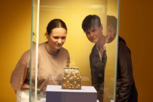 Fast täglich waren im Vorfeld der Eröffnung Kisten mit kostbarer Fracht in Paderborn eingetroffen, darunter so faszinierende Exponate wie die „Burse von Enger“ aus dem Kunstgewerbemuseum der Staatlichen Museen zu Berlin. Das Goldschmiedewerk aus dem 8. Jahrhunderts wird erstmals zusammen mit Stücken von vergleichbarem Rang gezeigt, zum Beispiel mit der „Großen Fibel von Dorestad“ – einer goldenen Gewandspange aus dem Rijksmuseum van Oudheden in Leiden. Das Musée de La Cour d’Or in Metz hat die erhaltenen Teile des reichverzierten Sarkophags von Ludwig dem Frommen, des Gründervaters der Abtei Corvey, geschickt. Die berühmte Stiftsbibliothek St. Gallen stellte kostbare Fragmente eines Werks des römischen Dichters Vergil zur Verfügung. Corvey selbst trägt mit der fast 1.200 Jahre alten, originalen Inschriftentafel vom Westwerk der mittelalterlichen Abteikirche zur Ausstellung bei.