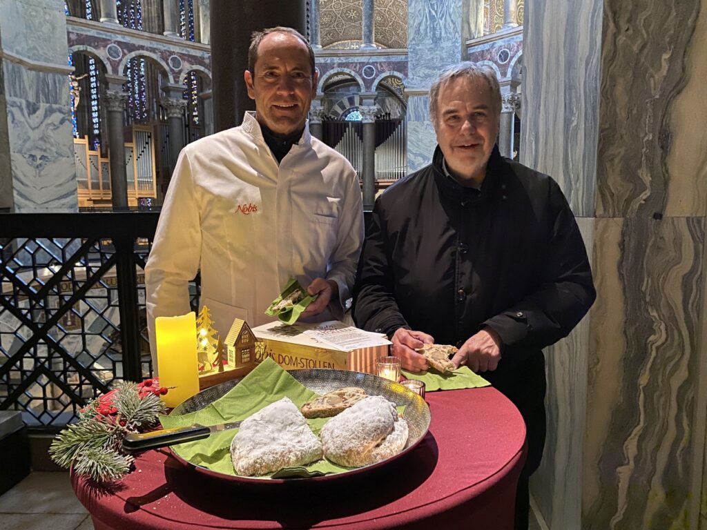 Michael Nobis bedankte sich bei Dompropst Cremer für die prominente Lagermöglichkeit. Der Aachener Dom sei ein ganz besonderes Bauwerk mit einem idealen Klima für die Reifung. Und auch Cremer zeigte seine Freude über die „süße“ Kooperation, denn pro verkauftem Stollen stiftet die Bäckerei Nobis Printen 8 Euro für den Erhalt des Doms, dessen Unterhalt jedes Jahr enorme Summen verschlingt.