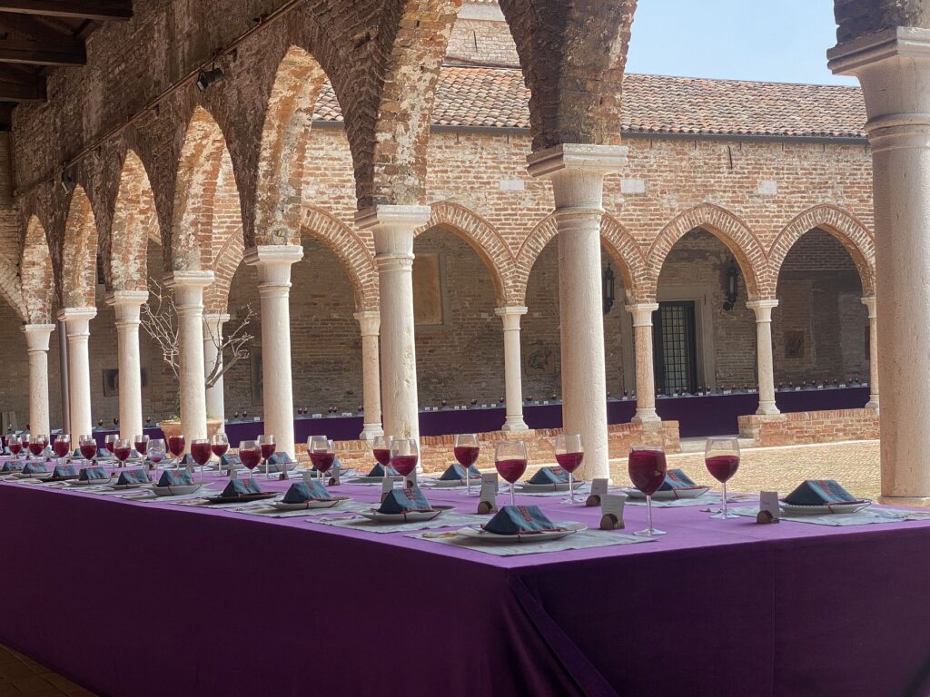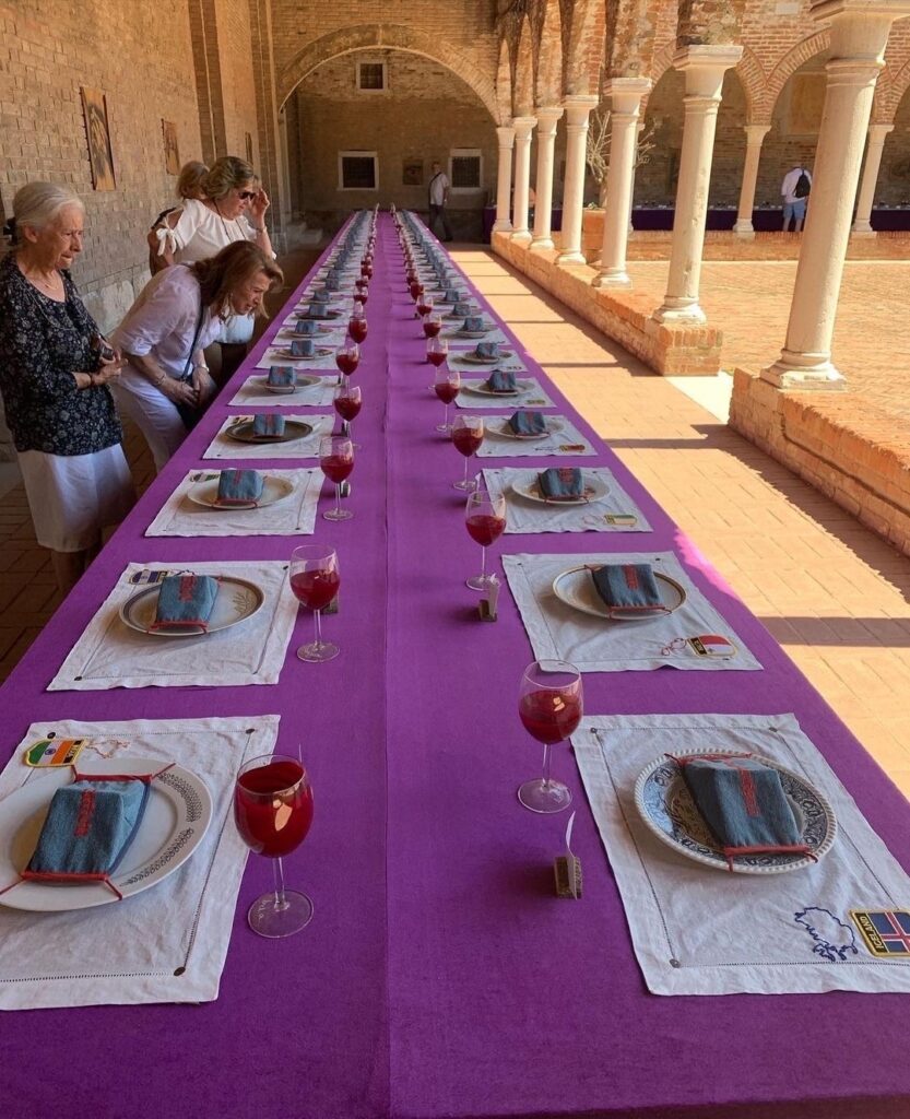 To this end, Muller, of German descent, set up long dining tables draped in purple velvet around the entire cloister courtyard. All the countries of the world were represented in the form of unique hand-made place settings. On top of customized placemats for each country were set 199 precisely filled glasses representing the level of their respective gross domestic product, with place cards hinting at further economic data of each country. Every tiny detail of the installation was researched and meticulously presented. Hand-sewn facemasks made of denim sat on each plate like food were a reminder of the worldwide pandemic, simultaneously serving as a metaphor for hunger in the world, not being able to eat nor speak, signifying lack of freedom of speech and identity.