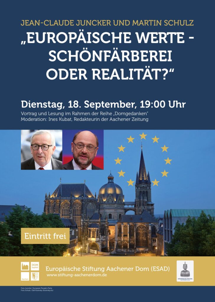 Summit meeting of two winners of the Charlemagne Prize: On Monday, 18 September, at 6 p.m., Jean-Claude Juncker, former President of the European Commission, and former EU Parliament President Martin Schulz will enter into a dialogue at the invitation of the European Foundation Aachen Cathedral (ESAD).