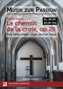 En lieu et place, l’organiste de la cathédrale Michael Hoppe crée une « musique pour la Passion » à l’orgue et joue le « Chemin de croix / Le Chemin de la croix » de Marcel Dupré. Cette œuvre complexe, qui compte parmi les compositions les plus importantes du 20e siècle pour l’orgue, n’est pas clairement attribuable à un genre musical, mais se présente comme une méditation à l’orgue, combinée à des considérations textuelles contemporaines de l’animateur pastoral Stefan Voges.