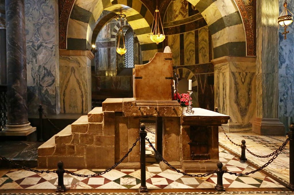 Eine Frage bleibt ungeklärt: Warum wurden ausgerechnet diese schlichten Marmorplatten zum Bau des Throns herangezogen? Eine in Aachen beliebte Theorie besagt, dass sowohl die Platten als auch die Stufen aus der Grabeskirche in Jerusalem stammen und somit selbst Reliquiencharakter haben. Damit wäre die Ästhetik natürlich zweitrangig. Wissenschaftliche Belege dafür gibt es keine.